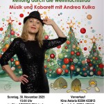 Zu Beginn der Weihnachtszeit gibt es am Sonntag, 30.11.2025, dem 1. Advent, um 15:00 Uhr ein Wiedersehn mit der Kabarettistin Andrea Kulka im Kino „Astoria“. In ihrem Programm „Weihnachtsmann und Karpfen blau – Rettung durch die Weihnachtsfrau“ möchte die schlagfertige Kabarettistin in verschiedenen Rollen und mit ihrem urkomischen Talent sich und das Publikum in eine lustig-(aus)gelassene Weihnachtsstimmung bringen!