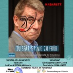 Auch 2024 gibt es wieder „Kunst im Kino“ im Wittstocker Kino „Astoria“ Jan-Peter Petersen (Gründer, Autor und Schauspieler des Hamburger Kabaretts Alma Hoppe) präsentiert sein neues Solo-Programm: „zu spät ist nie zu früh“